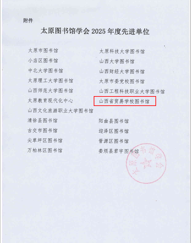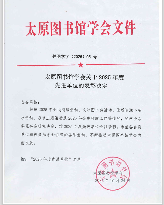 近日,太原图书馆学会印发《关于2025年度先进单位的表彰决定》,我校图书馆凭借扎实的全民阅读推广成效,获评“2025年度先进单位”荣誉称号。