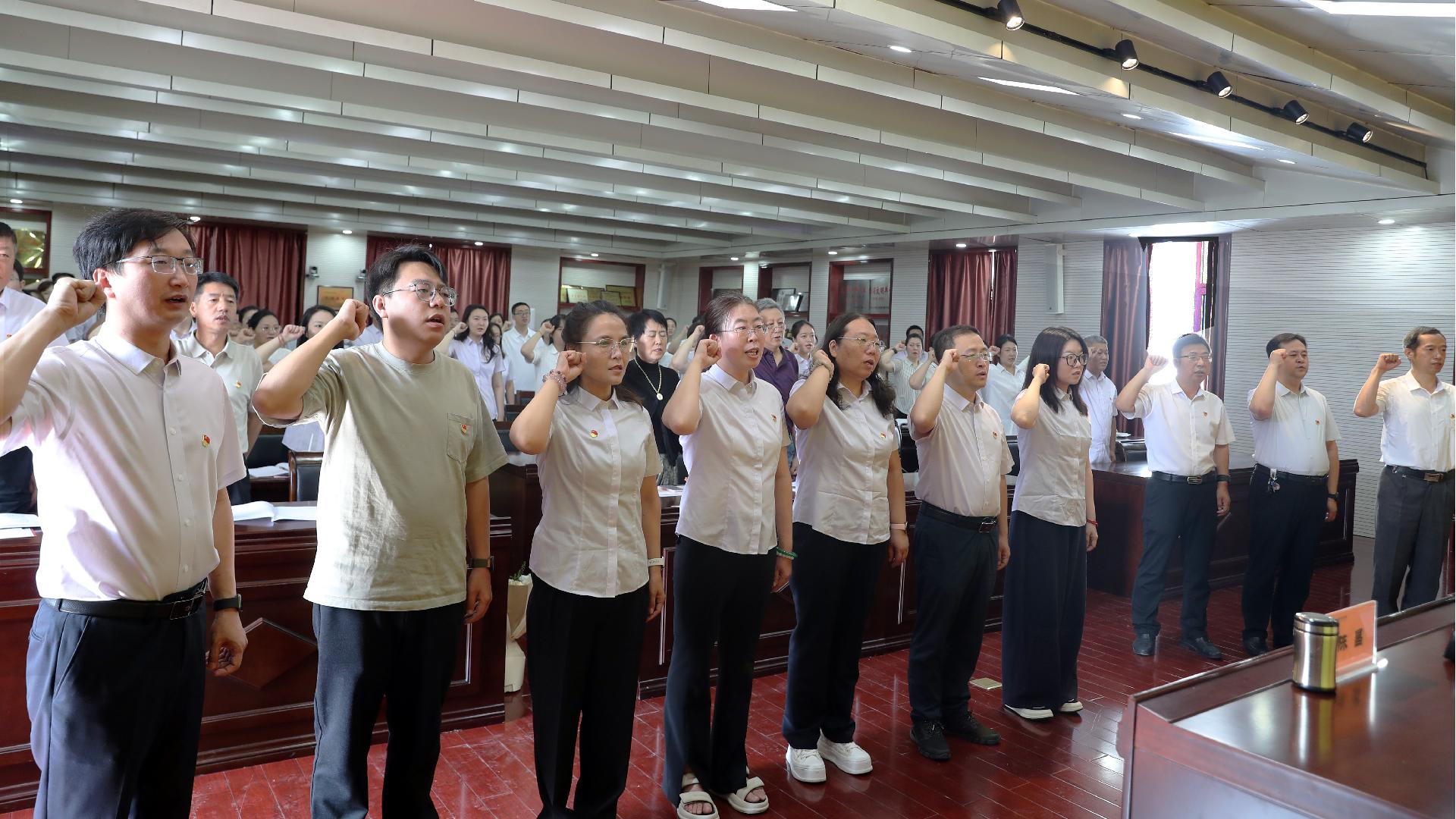 在新党员宣誓仪式上,在校党政办公室主任马长春同志的带领下,全体新党员面向党旗庄严宣誓,老党员们一同重温入党誓词,铿锵有力的誓言在会议室内回荡,彰显了党员们对党的忠诚与担当。