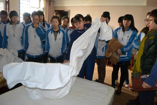 酒店能工巧匠给学生现场示范中式铺床