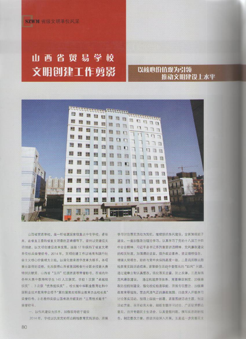 2014年,我校在各级文明委的正确领导下,以培育和践行社会主义核心价值观为主线,以深化教育教学改革为抓手,不断完善文明创建机制,大力开展公民道德建设“五个一”活动,取得积极成果。反映我校文明创建工作成果的文章《以核心价值观为引领 推动文明建设上水平》也被刊登在《山西画报》第21期。
