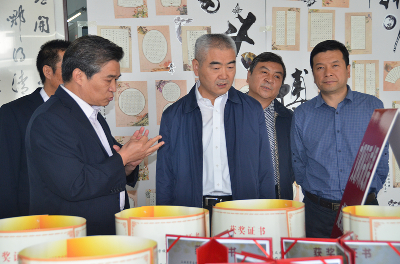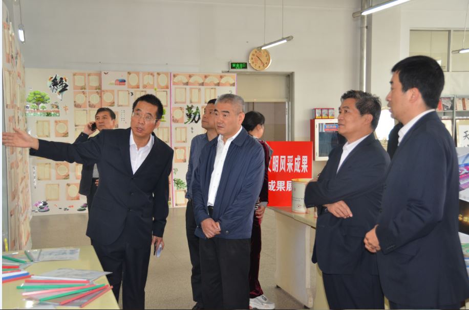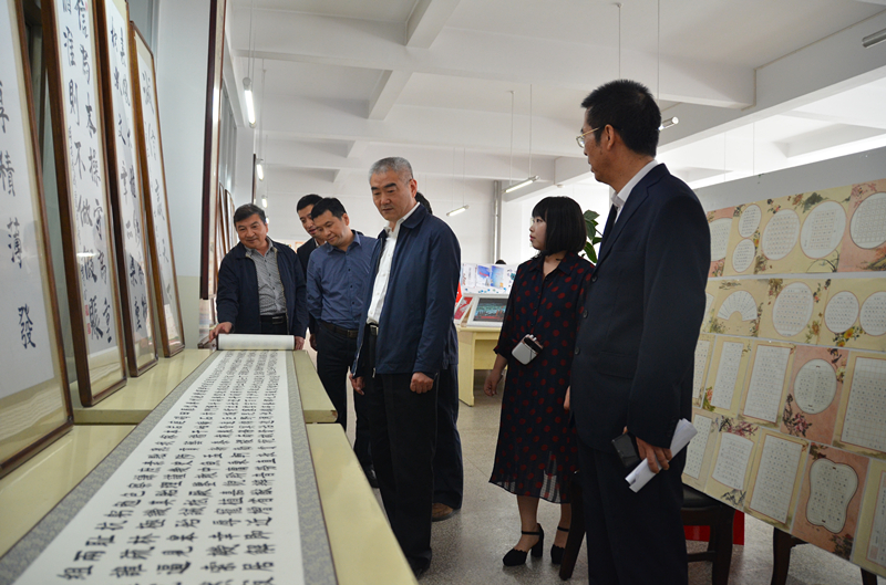 图5:王局长一行在学生书法展区观看学生的书法作品。