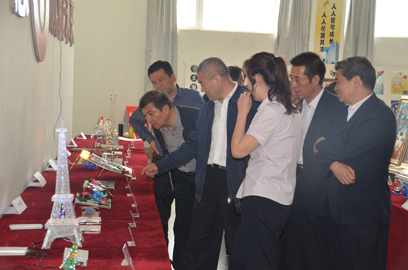 图6:王局长一行在电子产品装配作品和手工焊接艺术造型 作品展区观看学生小发明成果。