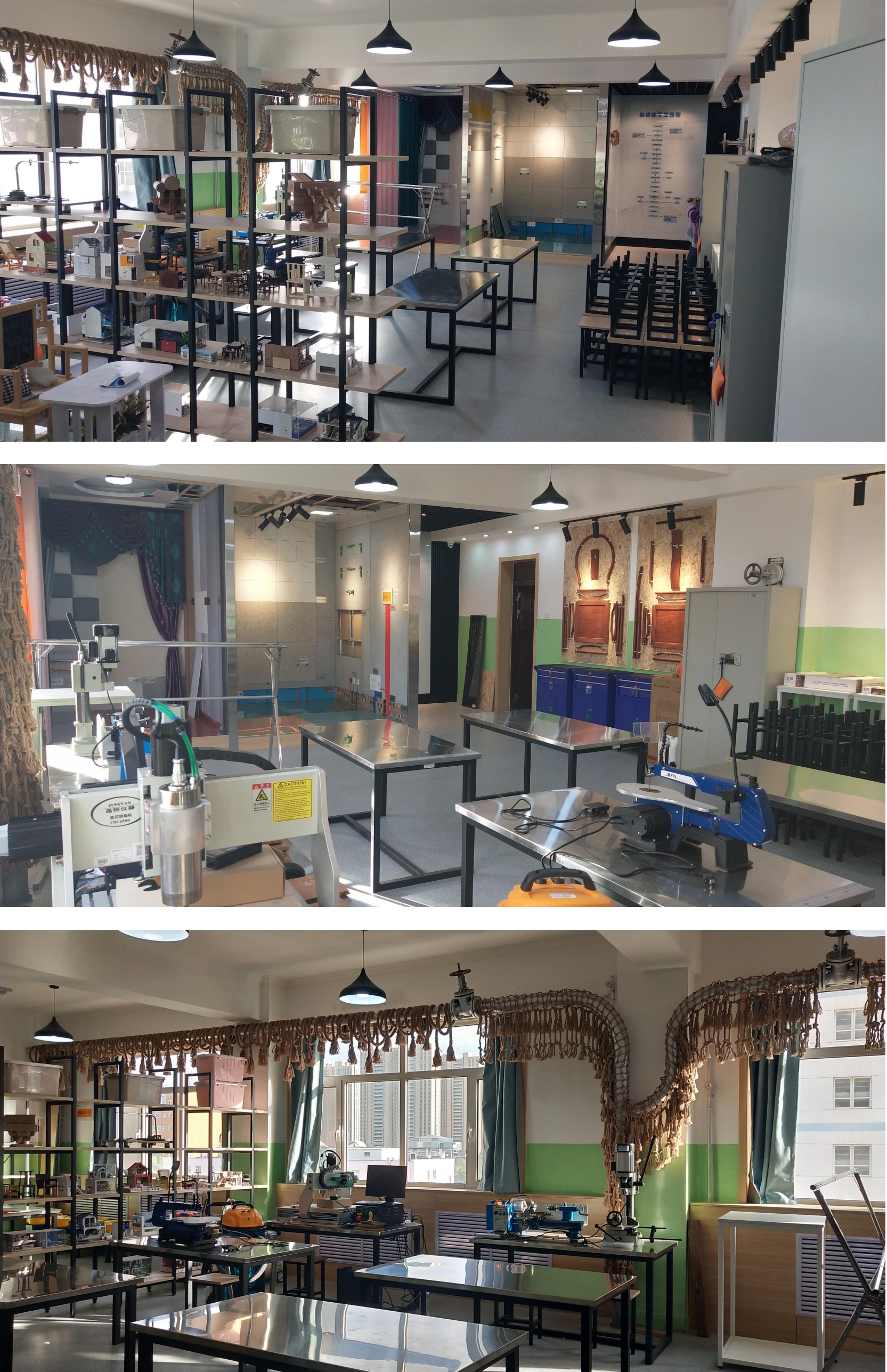 高水平工艺美术重点专业硬件设备建设项目——工艺美术实训室,经过市场调研、方案制定、审批、招标、施工、安装调试等建设环节,于2021年9月30日建设完成,通过验收。工艺美术实训室是融合室内设计、民间工艺、纤维饰品与设计等于一体的多功能综合实训室。该实训室的建成更加完善了艺术设计类专业的实训条件;更大程度地满足了《施工工艺与流程》《家具设计与工艺》《室内设计》《材料装饰画》《构成基础》等课程的教学需求;实现了工艺美术专业的施工工艺与流程、家具设计、室内设计方面多门课程的教学实训、课程设计、综合实训、学生毕业设计、技能大赛训练及教学研究等功能。