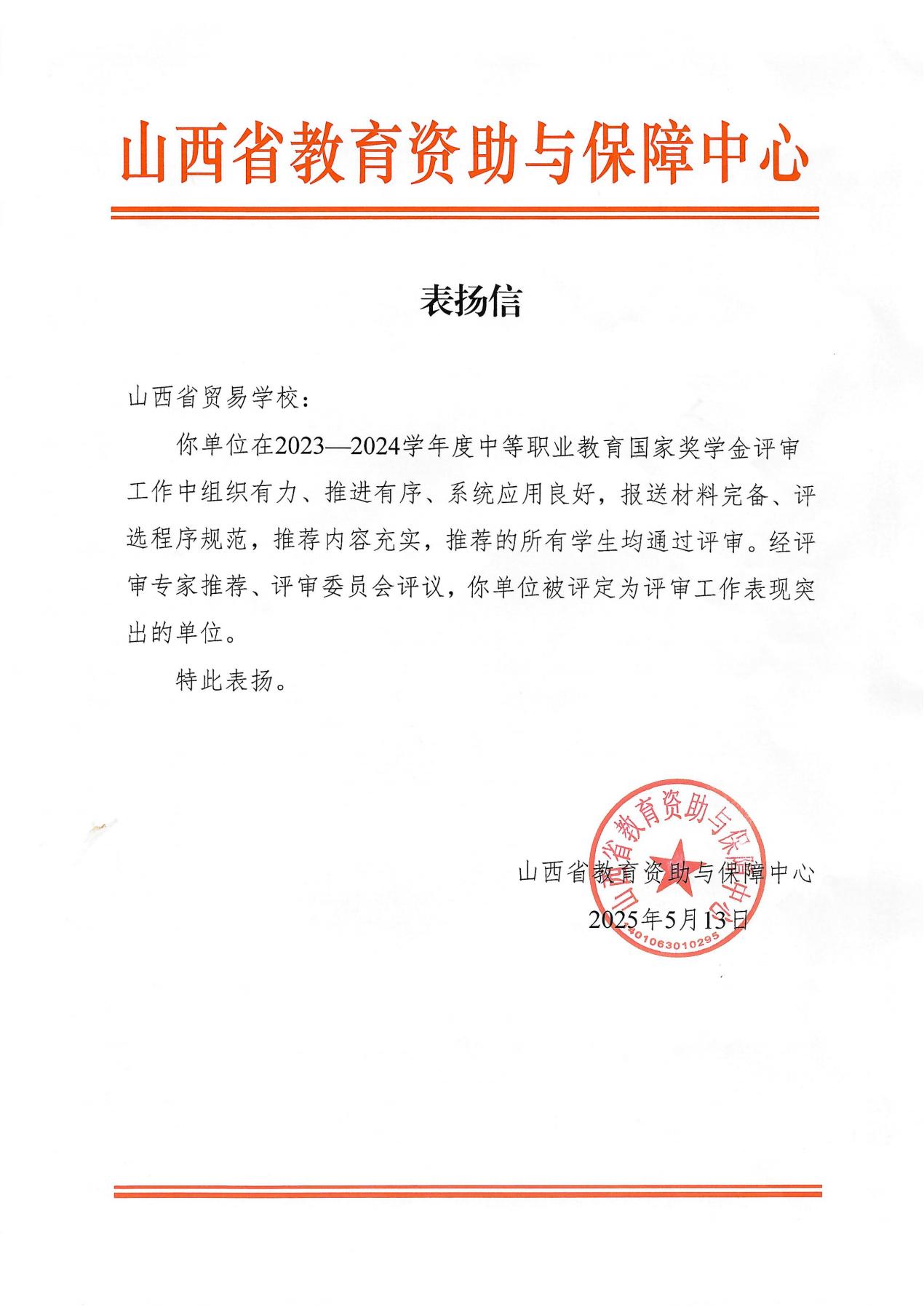 在校党委的正确领导下,在全校学工队伍协同努力下,我校在2023-2024学年国家奖学金评审工作中凭借严谨规范地工作管理、公平公正地评审组织以及精准高效的数据填报,得到山西省教育资助与保障中心充分肯定,被评定为“评审工作表现突出的单位”并致信表扬(如图)。