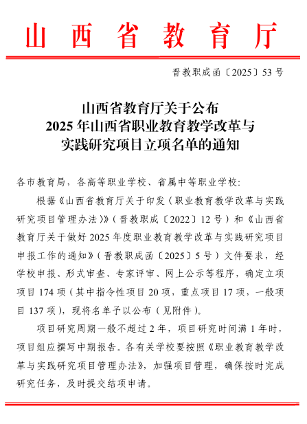 近日,山西省教育厅公布了2025年山西省职业教育教学改革与实践研究项目拟立项名单,我校孙岩卉研究团队和李珍研究团队申报的项目获批“一般项目”立项支持,具体立项情况如下: