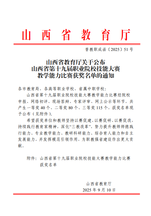 山西省职业院校技能大赛教学能力是全省职业教育领域最具影响力的教师教学赛事。自赛事启动以来,学校高度重视、周密部署,不仅制定系统化备赛方案,明确任务分工、压实责任链条,更构建“系部初筛、校赛选拔、省级精练”的全流程备赛体系,为参赛教师提供全方位支持与保障。各参赛团队凝心聚力,以“精益求精、争创一流”为目标,潜心钻研课堂教学改革路径,熟练依托现代信息技术平台整合优质教学资源,展现出扎实的学科功底与鲜明的教学特色。