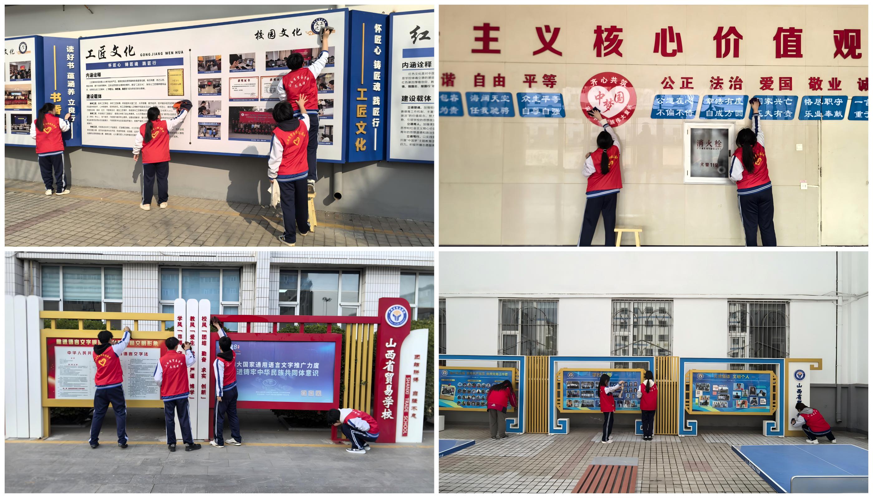 志愿先行,点亮校园。启动仪式结束后,志愿者们迅速行动,以小组为单位前往各自负责的清扫区域开展清洁工作。各小组分工明确、配合默契,认真完成每一项任务。有的仔细擦拭宣传栏,让校园文化阵地焕然一新;有的精心美化实训室,为同学们营造整洁舒适的学习环境。志愿者们挥洒汗水,用实际行动换来了校园的整洁与优美,共同谱写了一曲动人的志愿服务乐章。他们充分发扬不怕苦、不怕累的精神,用青春活力诠释了新时代的雷锋故事,让雷锋精神在校园里落地生根、开花结果。