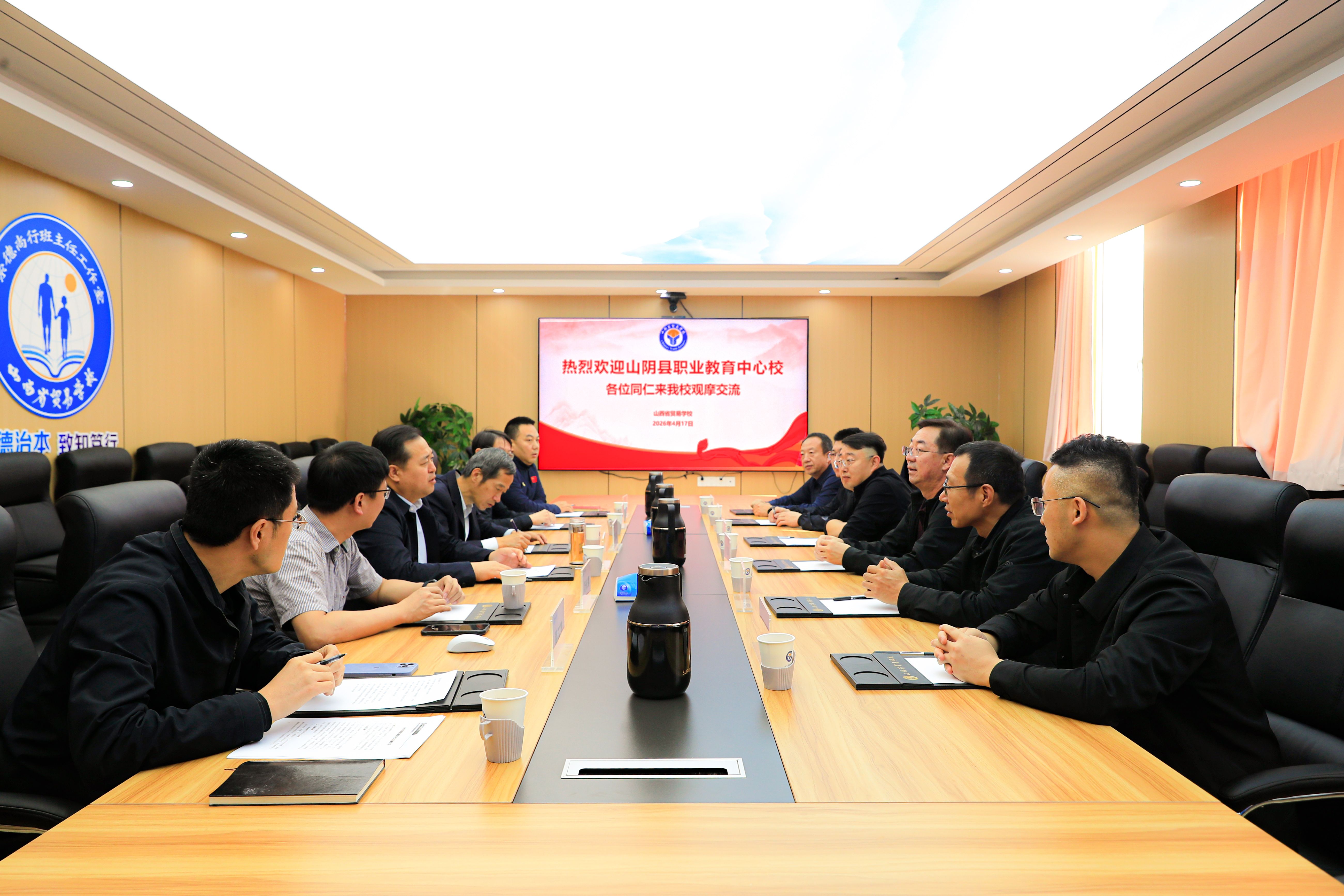 2026年4月17日上午,山阴县职业教育中心校党委书记、校长郭宏斌一行六人来我校开展交流活动。校党委书记、校长王成国,副校长陈昌、党政办公室、教务科、学生保卫科、信息中心等相关部门负责人参加了交流。