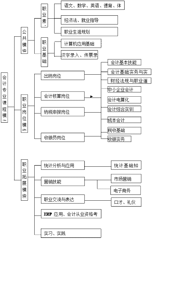 职业拓展课程模块。拓展与会计展业相关知识,通过在校内综合实训和校外顶岗实习,培训学生的职业综合能力,使学生能熟练运用会计核算方法,处理企、事业单位基本经济业务。