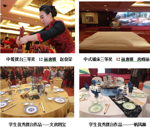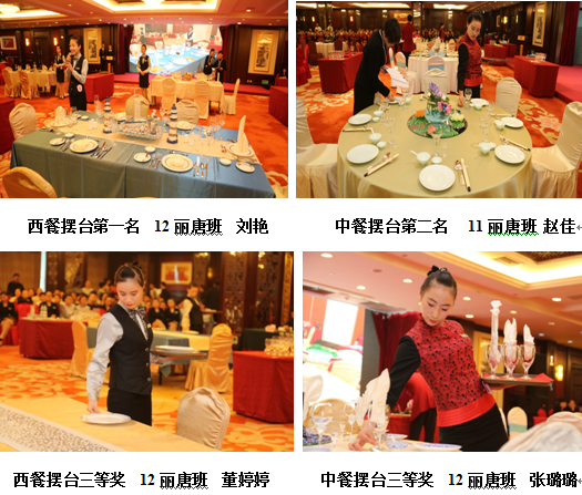 本次比赛设有中餐宴会摆台、西餐宴会摆台、客房铺床等12个竞赛项目。比赛中选手们将各自的实力和水平展现得淋漓尽致,尤其是中餐宴会摆台、西餐宴会摆台项目的12名参赛选手,有6名是我校11级的毕业生和12级的实习生,当主持人宣布“2号选手是来自山西省贸易学校的实习生”, “5号选手是来自山西省贸易学校的实习生”……台下响起阵阵掌声,而且在比赛中他们都取得了第一名、第二名和第三名的优异成绩,用实际行动践行了“今天,我们以校为荣,明天,学校以我为荣”的承诺。