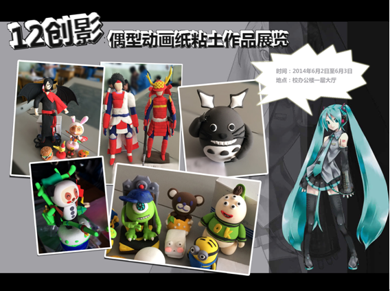 2014年6月2日至3日,在我校办公楼一层大厅举办了“12创影班动画偶型制作作品汇报展”。