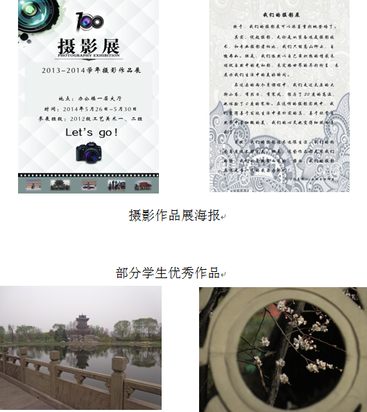 摄影是一门非常实用的课,同学们对这门课程热情高涨,积极学习。在短短七周的时间里,在孟玲玲、潘文英两位老师多次带领学生到太原市十大建筑群、山西省晋商博物馆、榆次老城等地现场教学,实地拍摄辅导,九十多名同学共拍摄了近700多幅作品。经过后期整理,修改,筛选出200幅优秀作品。为了鼓励学生们的学习热情,展示师生们的学习成果,经济技术系于2014年5月26日至2014年 5月30日,在学校办公楼一楼举办了摄影作品展。
