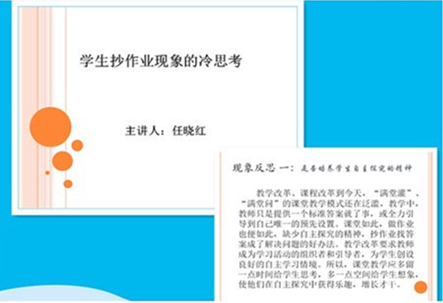 2018年4月4日,经济管理系全体教师围绕近期主题“学生抄作业现象的冷思考”开展了教研活动。此次教研由高级讲师任晓红老师主讲,全体教师参与研讨。