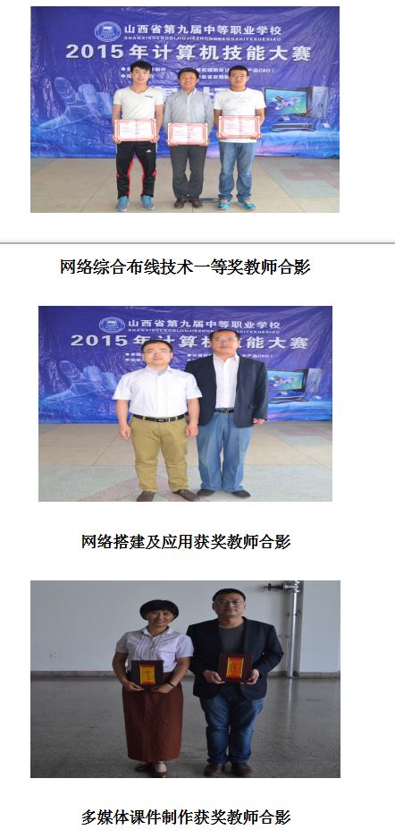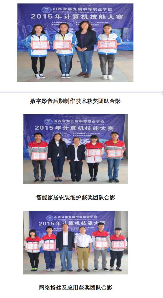 另悉,因网络综合布线技术项目获团体第一名,数字影音后期制作技术获个人第一名,智能家居安装与维护获团体第二名,以上3个项目我校将代表全省参加今年的全国计算机技能比赛。