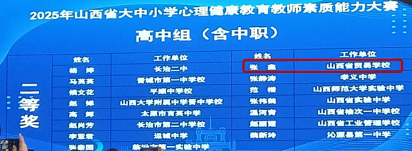 六月芳菲未尽时,捷报频传振人心。2025年5月24日至25日,由山西省教育厅主办的首届大中小学心理健康教育教师素质能力大赛决赛在山西大学举办。经过激烈角逐,我校心理健康教育教师张鑫斩获高中组(含中职)二等奖。这一佳绩既是个人风采的闪耀,更是学校关怀与团队智慧的结晶。